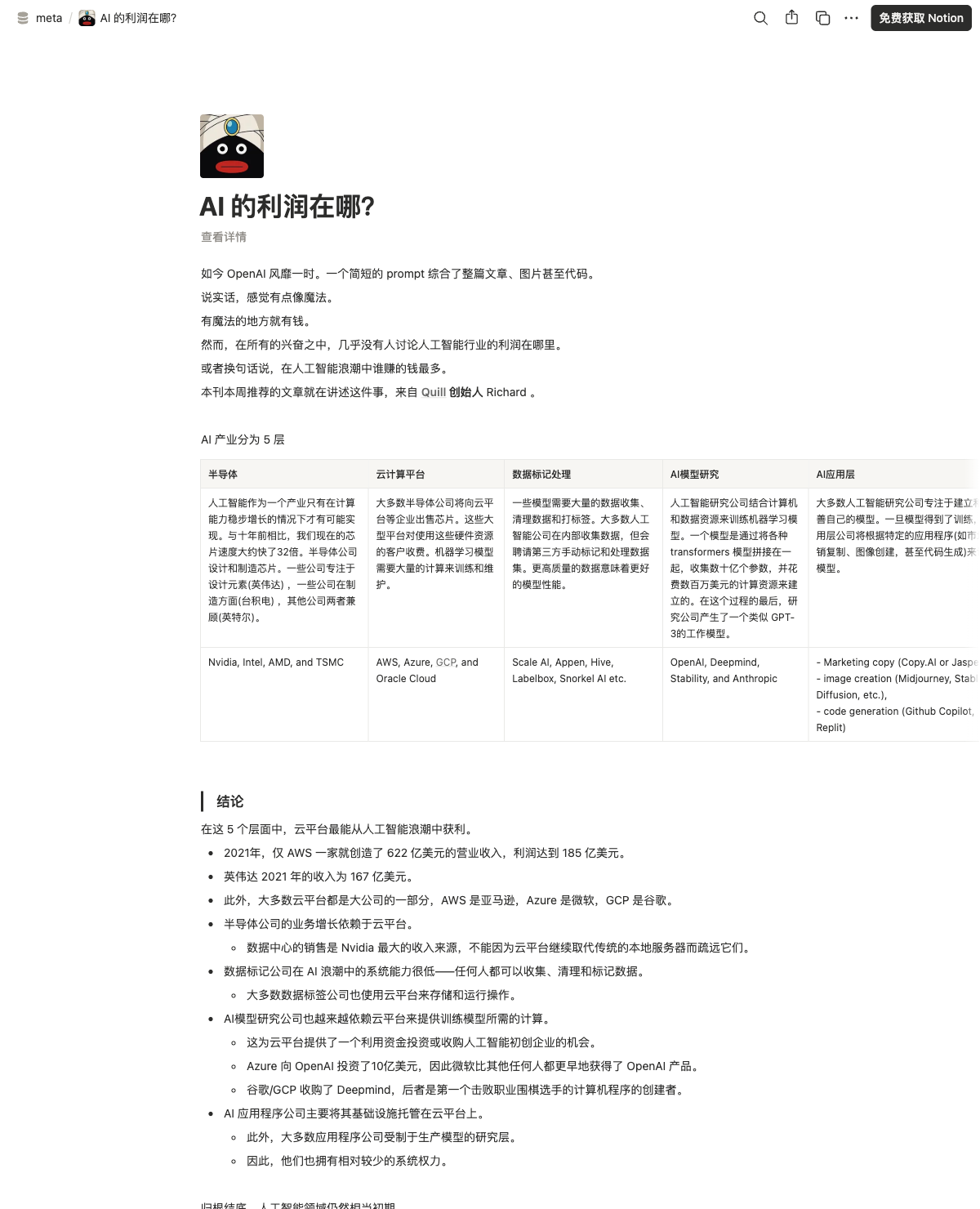 人工智能行业的利润主要集中在云计算平台上,2021年AWS创造了622亿美元的营业收入。半导体公司和AI模型研究公司依赖云平台的计算资源,而数据标记公司的能力较低。尽管AI领域仍处于初期阶段,未来可能会有新的公司涌现,但云平台将在生态系统中继续占据主导地位,获得大部分利润。