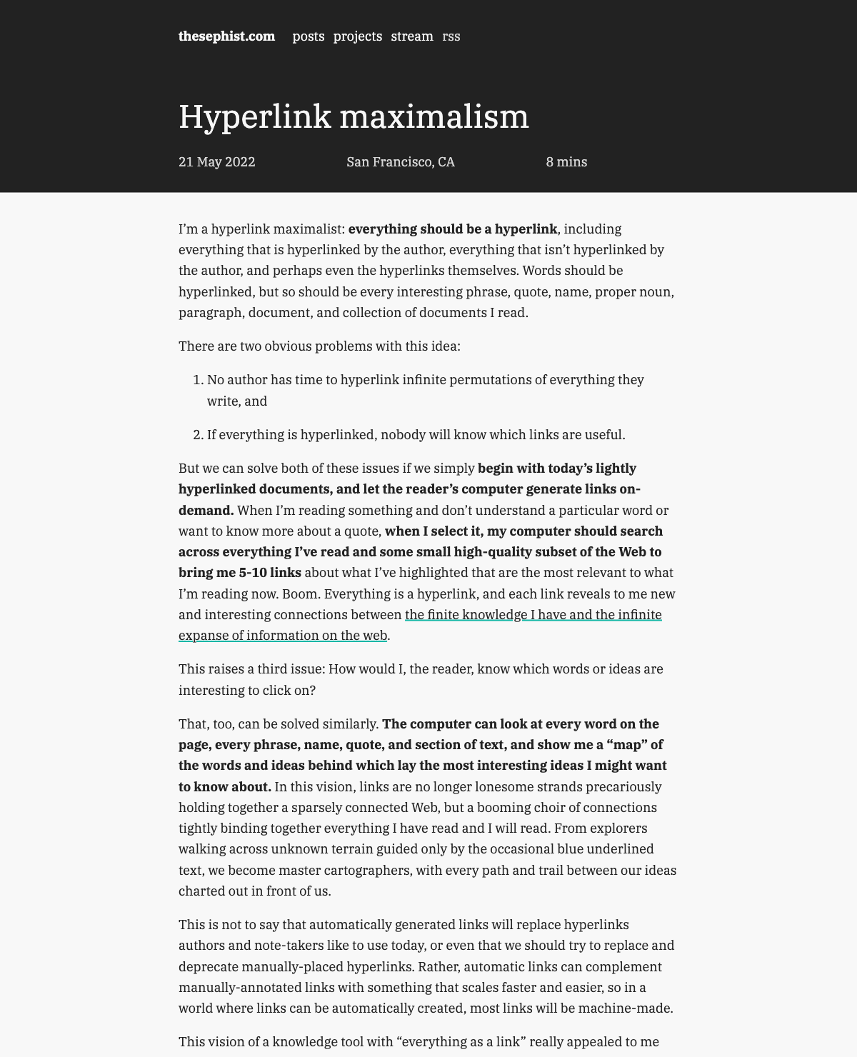 Linus提出超链接极大主义的理念,主张所有内容都应为超链接,但面临作者无法链接所有内容的挑战。通过notation.app,计算机可以自动生成链接,帮助读者发现相关信息和想法之间的联系。该应用使用简单算法生成热点图,突出显示重要词汇和短语,促进知识的组织与探索。