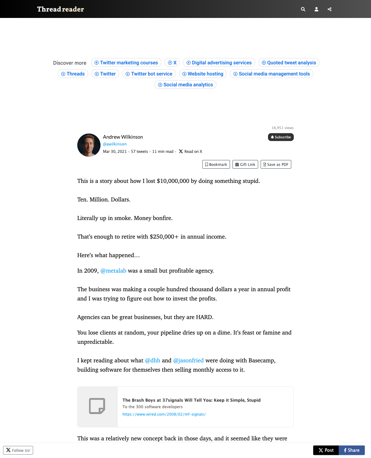 Andrew Wilkinson分享了他在竞争激烈的SaaS市场中,因缺乏资金和经验而导致的失败教训。他创建的待办事项应用Flow在面对Asana等竞争对手时,因未能有效应对市场变化和用户需求,最终投入超过1000万美元却未能成功。教训包括:在风险投资领域竞争需筹集资金、优秀产品不一定能胜出、以及营销的重要性。建议创业者选择小市场,控制成本,避免陷入功能竞争的陷阱。