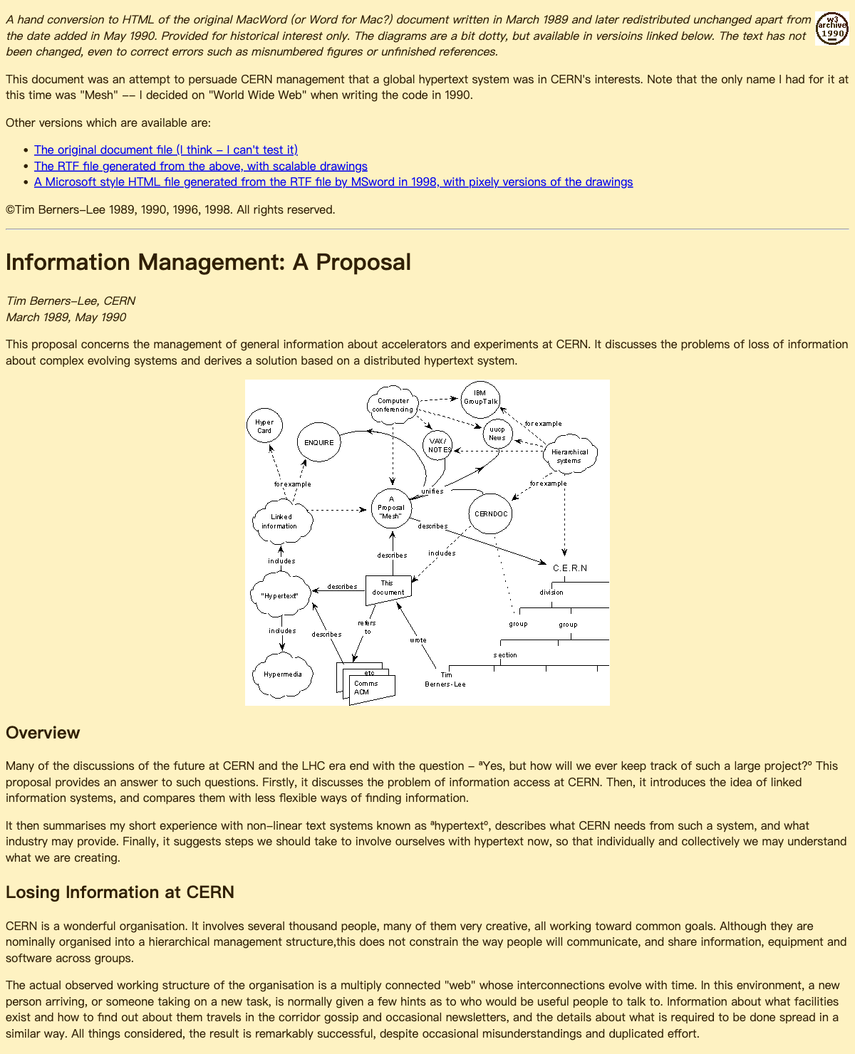 蒂姆·伯纳斯·李在1989年提出建立一个全球超文本系统的愿景,旨在解决CERN信息管理中的问题。该提案强调了链接信息系统的必要性,以应对信息丢失和人员流动带来的挑战,并提出了一个分布式、去中心化的超文本系统的构想,旨在促进信息的共享和访问。