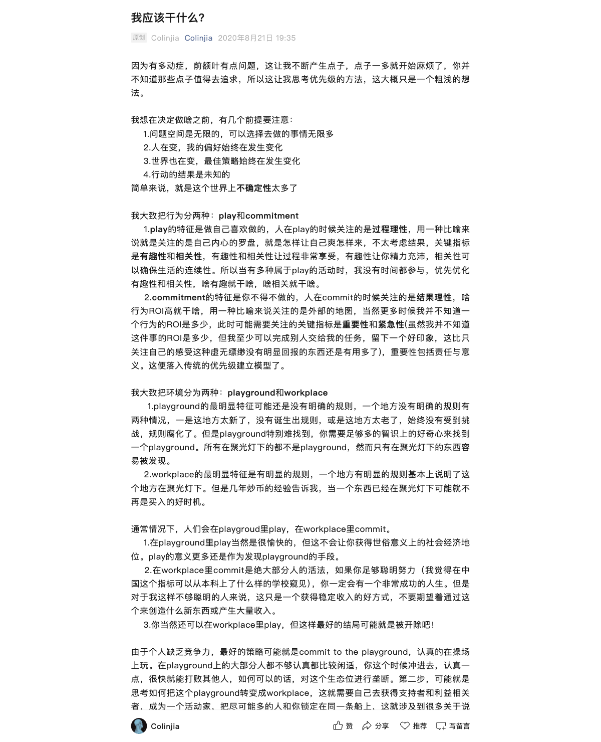 在不确定的世界中,优先级的思考包括关注内心的乐趣与外部的结果。行为分为“玩”和“承诺”,环境分为“游乐场”和“工作场所”。在游乐场中,追求兴趣和相关性,而在工作场所则关注重要性和紧急性。建议在拥有副业的基础上认真玩耍,以便在游乐场中获得成功,并转变为工作场所的支持者。