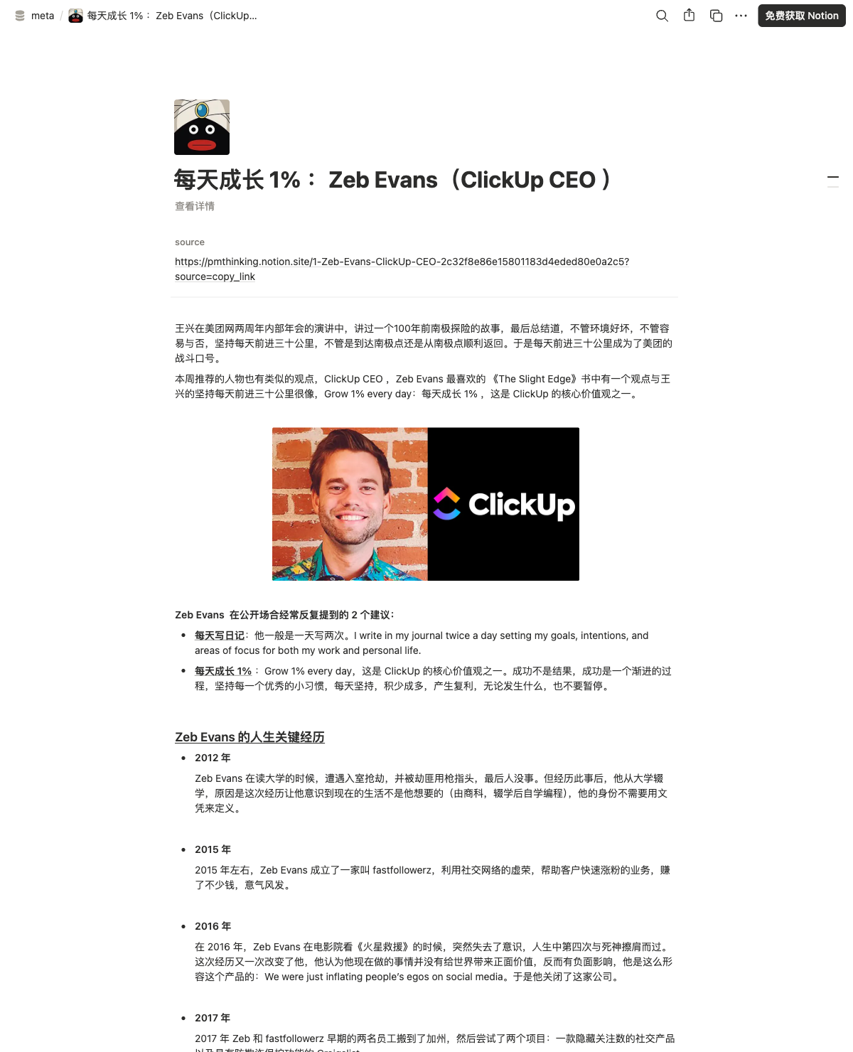 Zeb Evans, ClickUp的CEO,倡导“每天成长1%”作为核心价值观,强调坚持小习惯的重要性。他的经历包括大学辍学后自学编程,创办fastfollowerz并关闭后转向ClickUp。早期运营依靠SEO、内容营销和社区互动实现快速增长,避免依赖广告投放,注重有机增长。