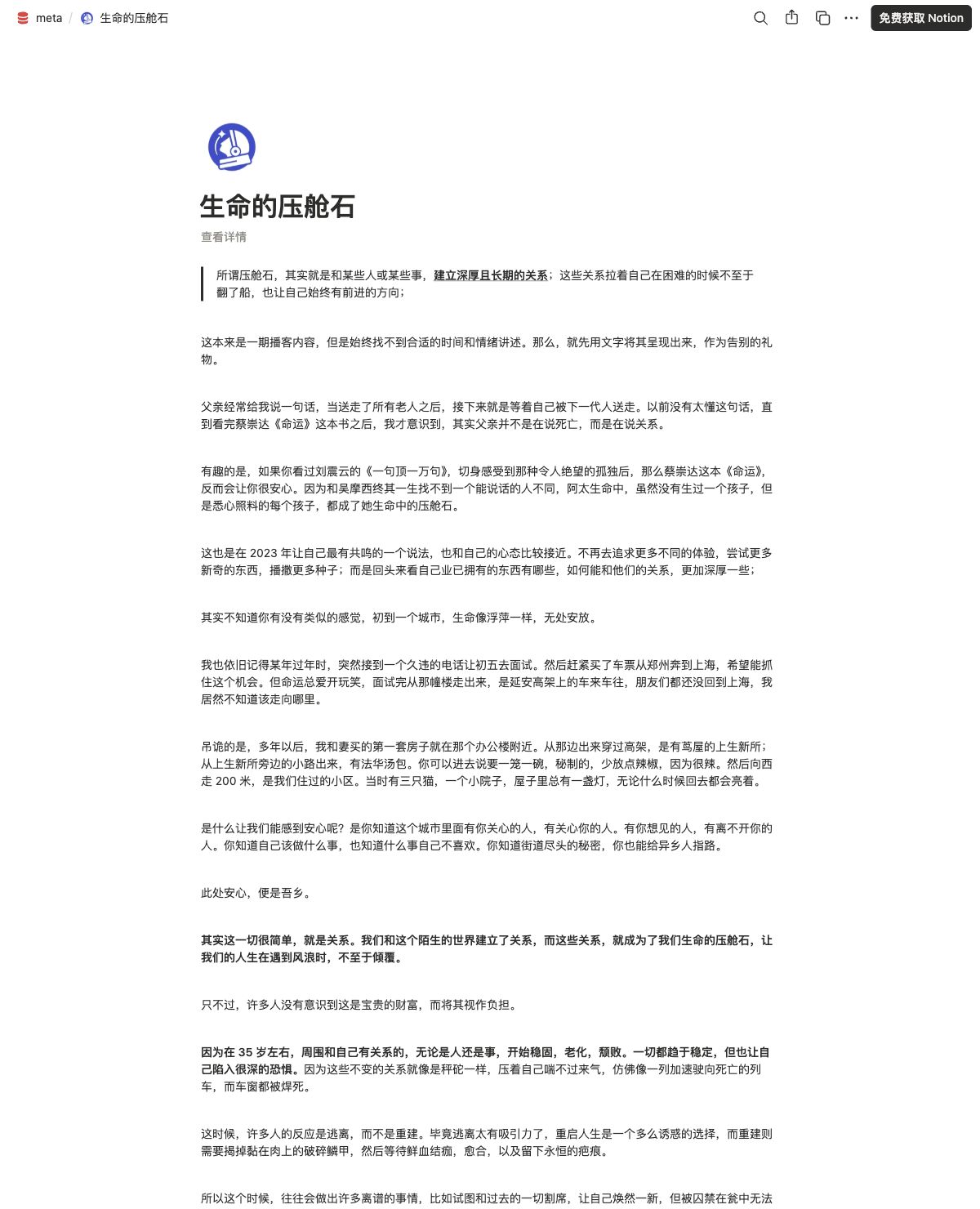 建立深厚且长期的关系是生命的压舱石,这些关系在困难时刻提供支持和方向。随着年龄的增长,许多人可能会感到这些关系成为负担,而非财富。重建生活的诱惑常常导致逃避,而忽视身边重要的关系可能会导致孤独和失落。真正的价值在于与已有关系的深度,而非追求新奇。生活的意义在于用时间与人和事建立深厚的联系,让这些关系成为抵御风浪的力量。